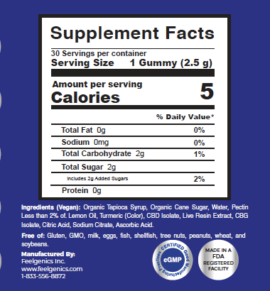 Our new Lemon–flavored CBD gummies are crafted with 100% hemp-derived, organic CBD isolate, delivering 20 mg of pure CBD & 10 mg of CBG per gummy with no unnecessary additives. They are THC-free, manufactured in an FDA-regulated facility in the USA, and independently third-party tested for quality and purity. These gummies are made with natural beet sugar and contain no high-fructose corn syrup, corn syrup, artificial colors, or artificial flavors.